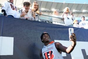 Cincinnati Bengals cornerback Mike Hilton (21) takes a photo with fans before the Bengals face the Philadelphia Eagles Sunday October 27, 2024 at Paycor Stadium.