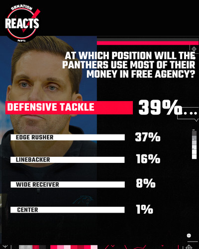 With the start of the 2025 NFL Free Agency period only days away, we asked y’all where you think the Carolina Panthers will be spending their money this year. Expectations are that the Panthers will be relatively busy this year The team has two extremely cheap years left on Bryce Young’s rookie contract, so the feeling in the building is that the iron is hot and there is not time like the present to forge a team. That said, Dan Morgan and Brandt Tilis have their work cut out for them and the overwhelming majority of Panthers fans apparently think that work will start in the trenches on the defensive side of the ball.