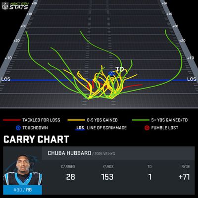 Reminiscent of the Panthers games of yore, the offensive run game was humming to the tune of 188 yards on 32 attempts. The freshly extended Chuba Hubbard was the biggest beneficiary with a personal record 153 yards on 28 carries. Hubbard had the most impressive rushing performance in the NFL this week by most statistical measures. Racking up nearly 40 yards more than the second place finisher in rushing yards, Hubbard also nearly doubled the second place rusher in NFL’s Next Gen Stats “rushing yards over expected” metric, averaging 2.61 yards over expected per rush in the process.